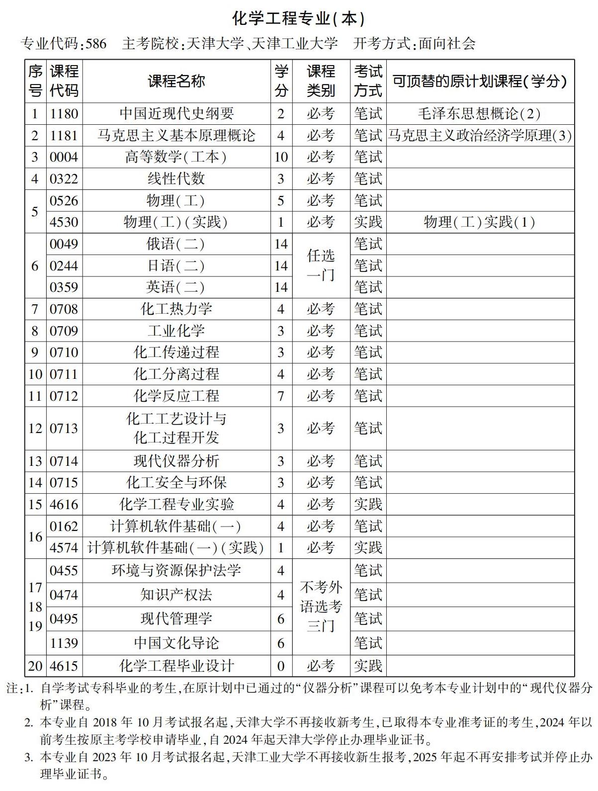 - 2023年10月天津自考本科化學(xué)工程專業(yè)計劃(停考過渡)