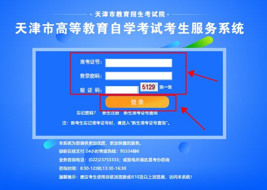 天津自考服務(wù)系統(tǒng)是天津自考成績(jī)復(fù)核的官方入口,參照上面的天津自考成績(jī)查詢(xún)指南,考生即可進(jìn)入天津自考服務(wù)系統(tǒng)。