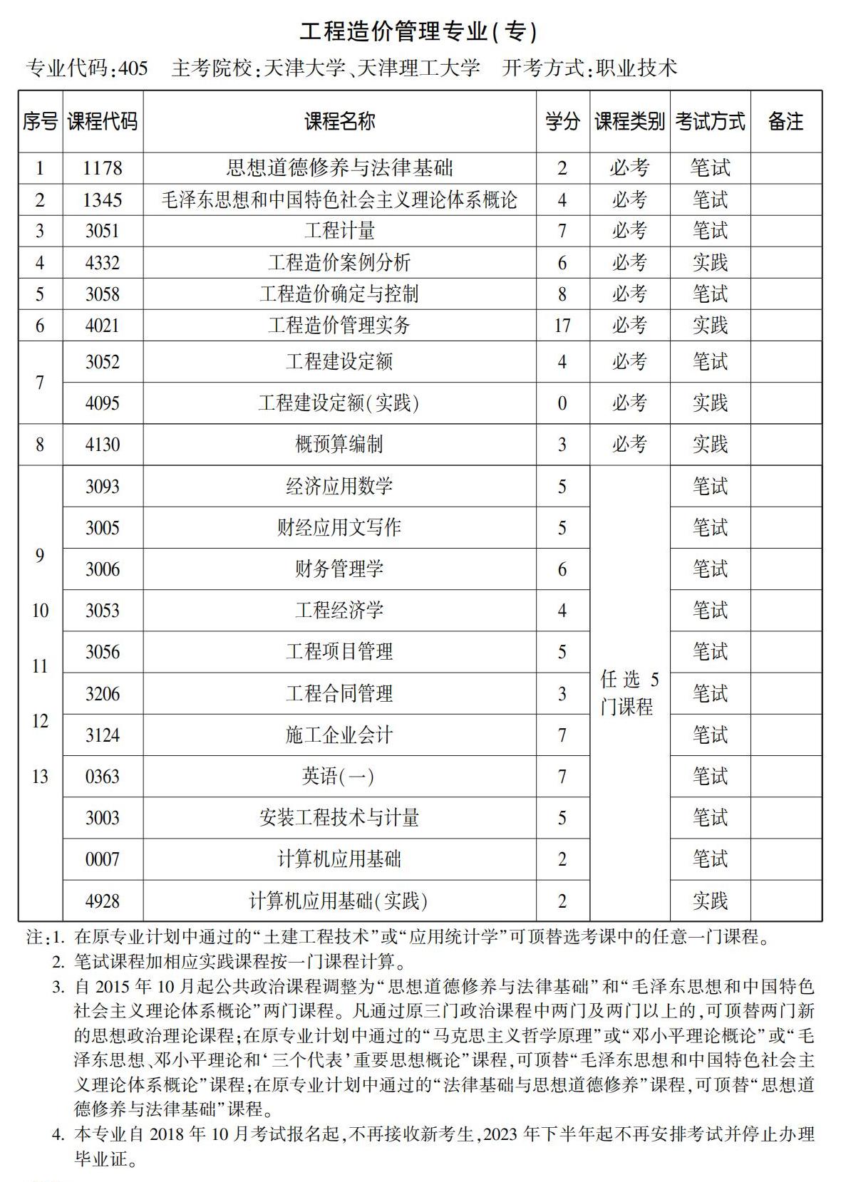 2022年10月天津自考專科工程造價管理專業(yè)計劃(停考過渡)