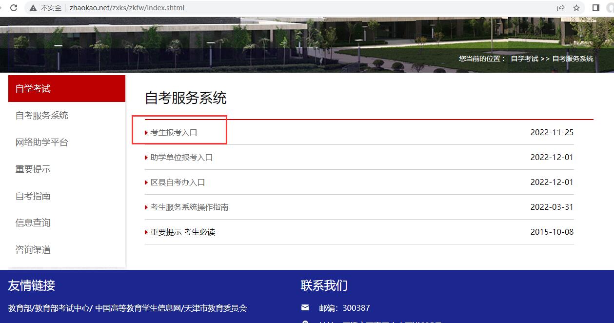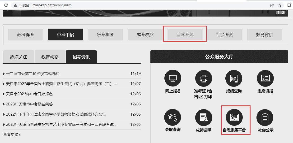 第一步:進入天津市招考網(wǎng)(www.zhaokao.net),選擇自學考試或下方自考服務系統(tǒng)