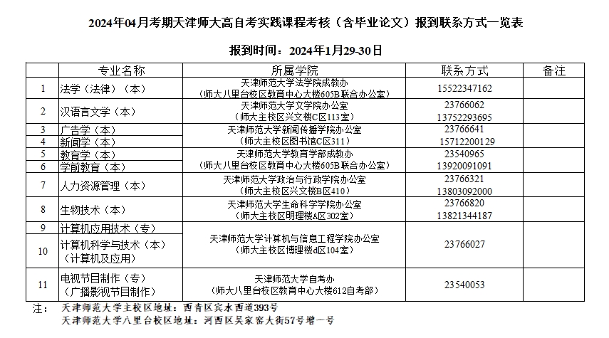 2024年04月考期天津師大高自考實(shí)踐課程考核(含畢業(yè)論文)報(bào)到聯(lián)系方式一覽表