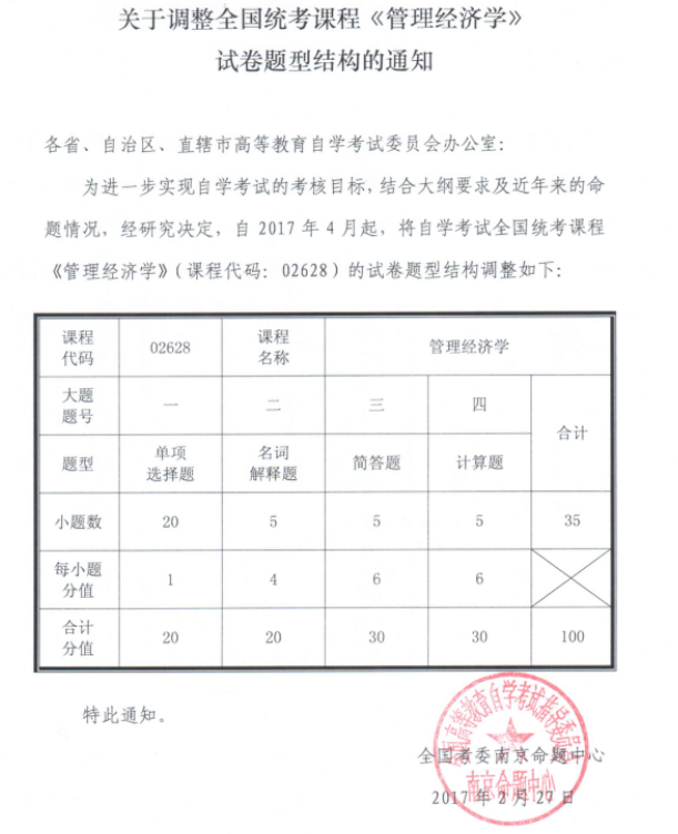 調(diào)整全國統(tǒng)考課程《管理經(jīng)濟(jì)學(xué)》試卷題型結(jié)構(gòu)的通知