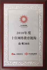 2010年12月20日,在“中國教育在線”和“中國教育和科研計算機網”共同主辦的首屆“教育公益盛典”活動中,自考365被授予“2010年度十佳網絡教育機構”榮譽。 |