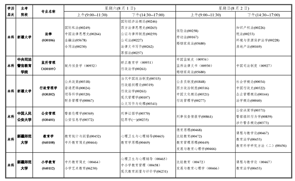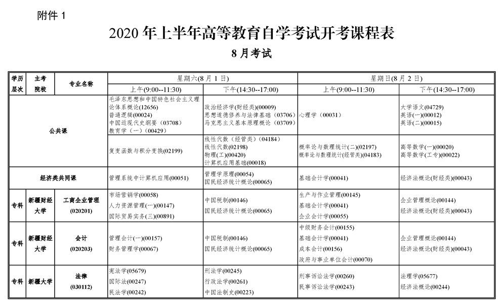 2020年上半年新疆自考考試課程安排表