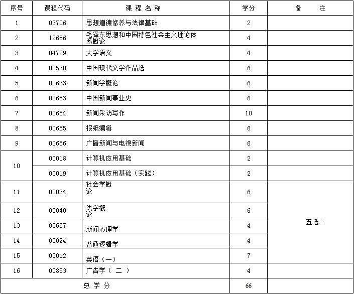 3、考生已通過原計劃有關(guān)課程的,可頂替本計劃中的相關(guān)課程:①“現(xiàn)代漢語”可頂替“大學(xué)語文(04729)(4學(xué)分)”;②“新聞理論”可頂替“新聞學(xué)概論(00633)(6學(xué)分)”;③“廣告學(xué)”可頂替“廣告學(xué)(二)(00853)(4學(xué)分)”;④“中國通史”可頂替五門選考課程中的任意一門課程。