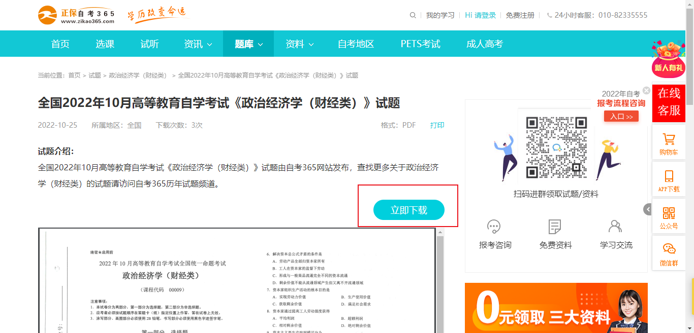 第四步:在搜索結果中,點擊您需要的某個考期的試題,進入試題詳情頁后,您可以選擇在線預覽試題,或點擊【立即下載】按鈕,即可把試題下載在電腦上。如下圖所示: