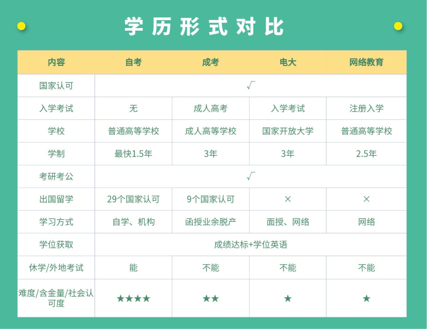 提高學(xué)歷的方式有好幾種,為什么建議你選擇自考?感興趣的學(xué)員可以看一下四大學(xué)歷形式的優(yōu)勢(shì)對(duì)比: