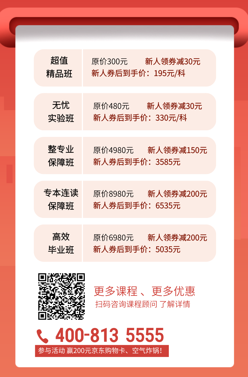 在本次活動(dòng)中,你可以收獲:報(bào)考常見(jiàn)問(wèn)題詳細(xì)解答、報(bào)考科目搭配建議、備考時(shí)間的分配建議、高效刷題神器以及輔導(dǎo)課程優(yōu)惠說(shuō)明,同時(shí),參與直播互動(dòng)、購(gòu)課的學(xué)員,均有機(jī)會(huì)獲得空氣炸鍋、200元京東購(gòu)物卡等豐富禮品哦!