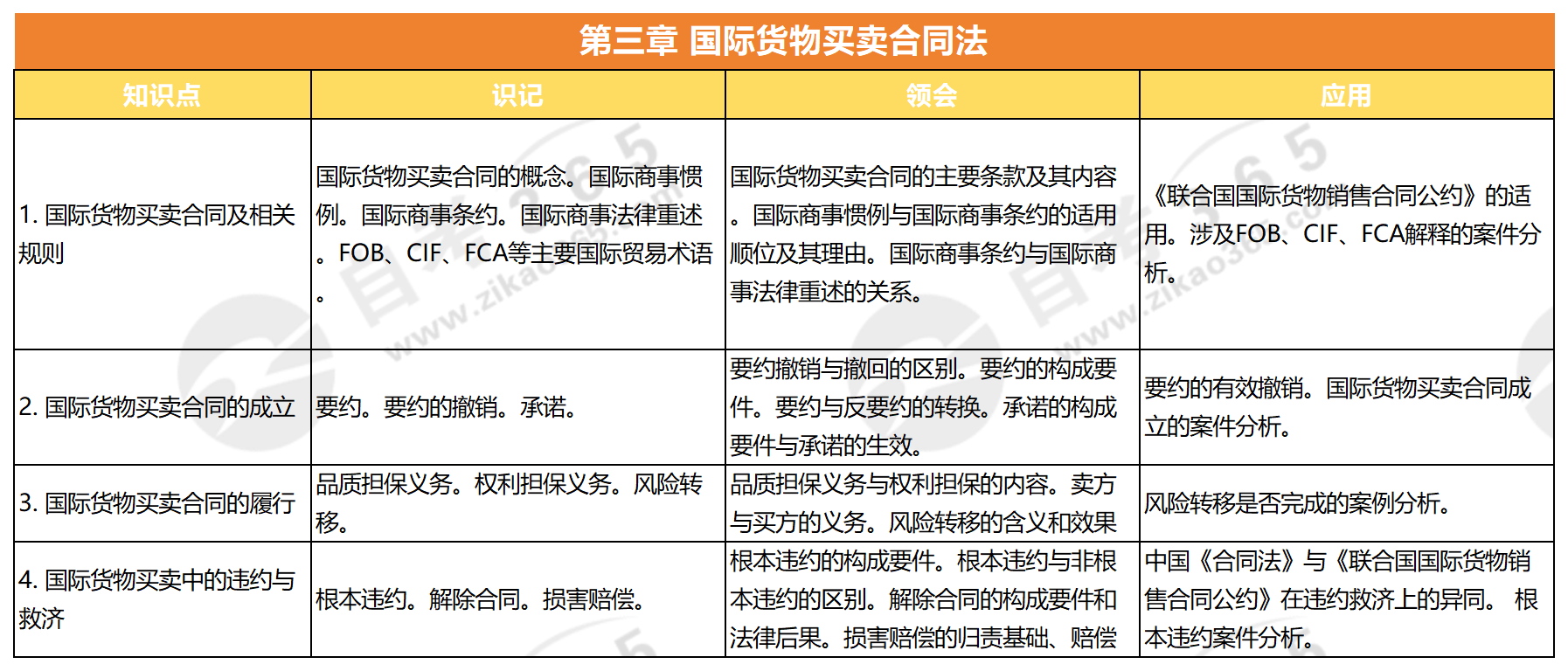 自考國際經(jīng)濟法概論,在備考第三章-國際貨物買賣合同法時,可以按照下表中的知識點深度進行學習:
