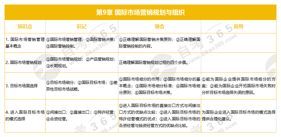 自考365為廣大考生整理了《國(guó)際市場(chǎng)營(yíng)銷(xiāo)學(xué)》這一科各個(gè)章節(jié)考點(diǎn)的學(xué)習(xí)要求,考生只需針對(duì)不同類(lèi)型的知識(shí)點(diǎn),按識(shí)記、領(lǐng)會(huì)、應(yīng)用三種層次來(lái)學(xué)習(xí)和練題,就可以學(xué)得更得心應(yīng)手。