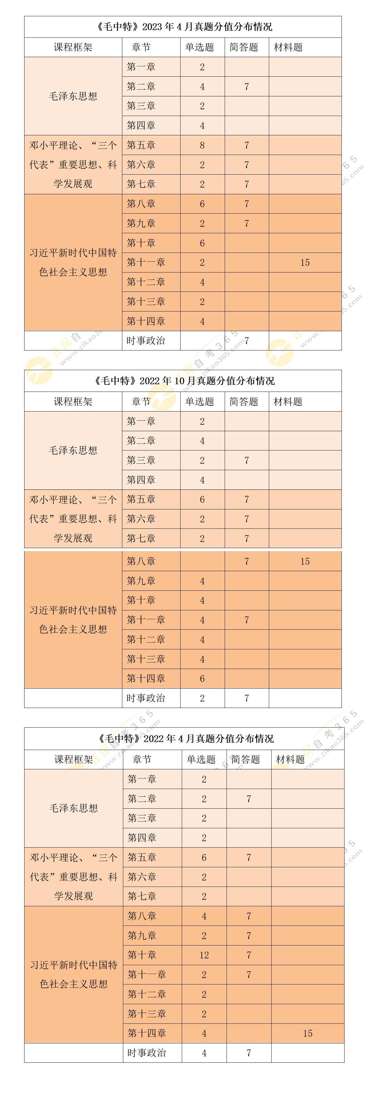 我們先看下近三個(gè)考期自考毛中特試題的題量分值分布情況: