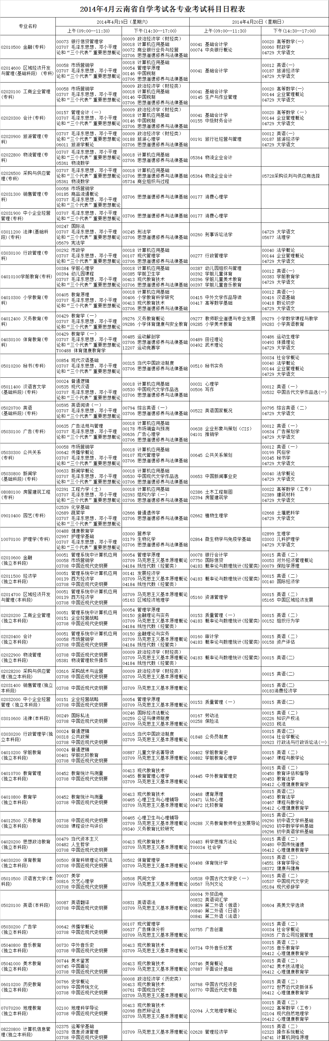 2014年4月云南自考各專業(yè)考試科目日程表