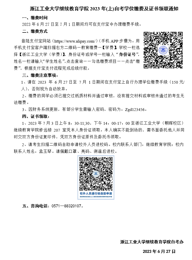 浙江工業(yè)大學(xué)繼續(xù)教育學(xué)院2023年(上)自考學(xué)位繳費(fèi)及證書領(lǐng)取通知