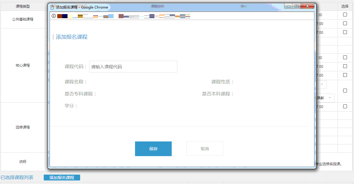 如需報(bào)考頁面所列課程以外的課程,點(diǎn)擊“添加報(bào)名課程”,在添加報(bào)名課程頁面填寫所需報(bào)考課程的代碼并保存。同一考試時(shí)間,只能選擇1門課程。