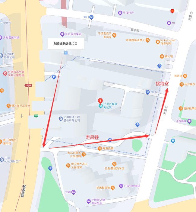 因開明街封道改造,請考生按文末示意圖自地鐵城隍廟站C口繞行壽昌巷至寧波市教育考試院接待室,此線路僅供行人通行。